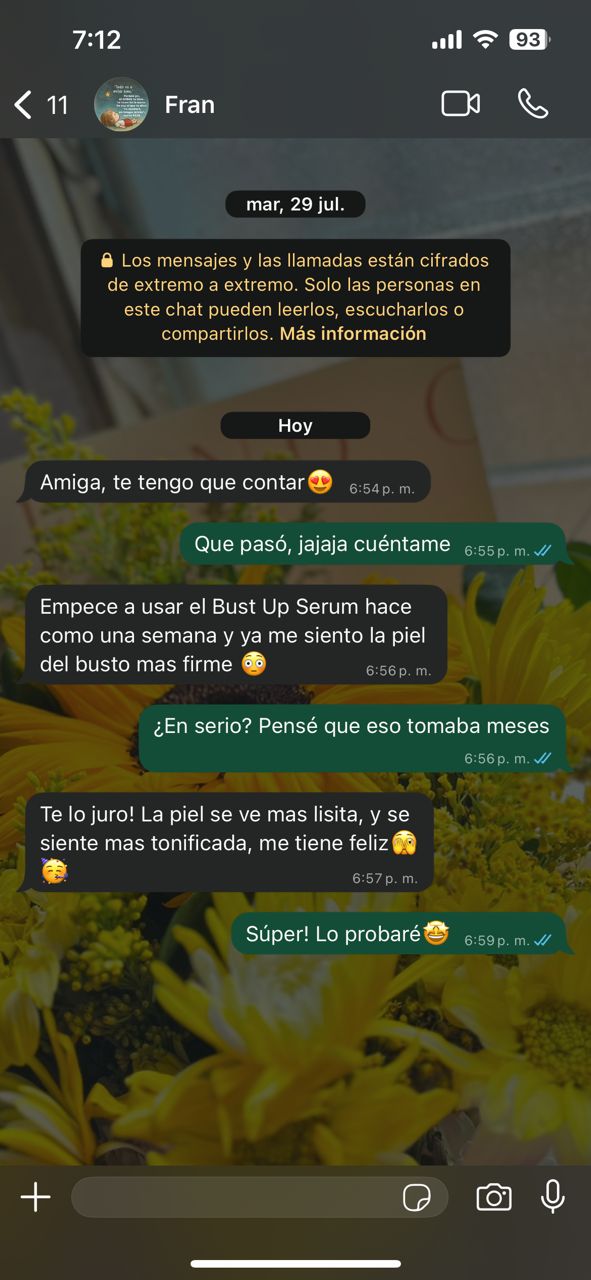 "Me encanta que Bust Up trabaje con mi cuerpo, ayudando al equilibrio natural de estrógeno y estimulando colágeno. Recuperé la forma sin cirugías, dolor ni efectos secundarios. ¡Confianza garantizada!"