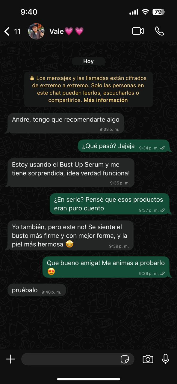 "Siempre fui plana, pero este serum realmente aumentó el volumen en semanas. Además, me dejó la piel sedosa y suave al tacto. ¡Me siento más femenina, segura y deseada!"