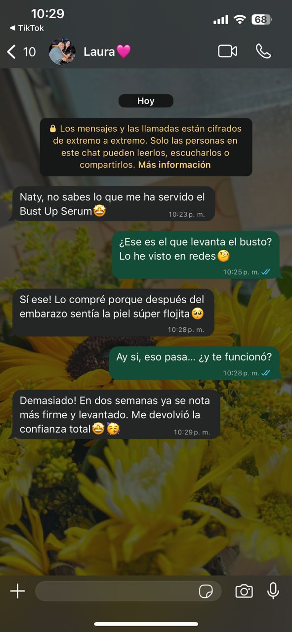 "Siempre fui plana, pero este serum realmente aumentó el volumen de forma natural. Ahora mi ropa luce mucho mejor y me siento mucho más segura."