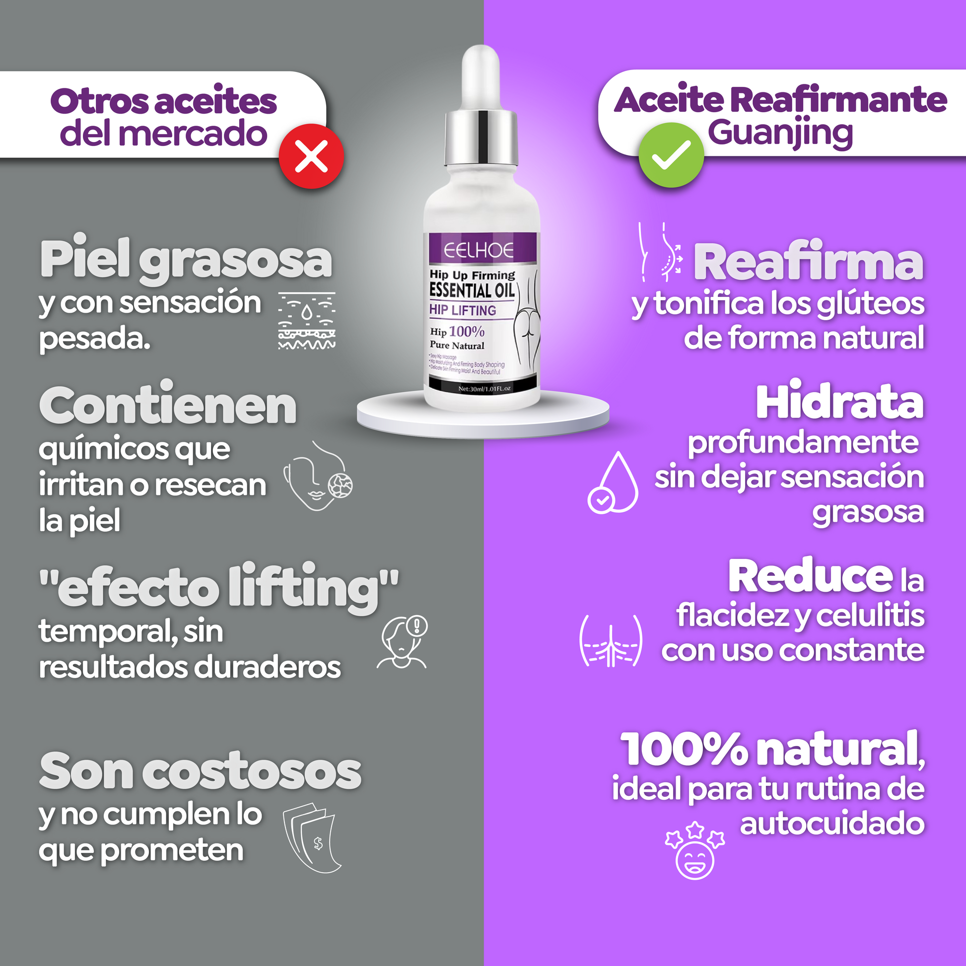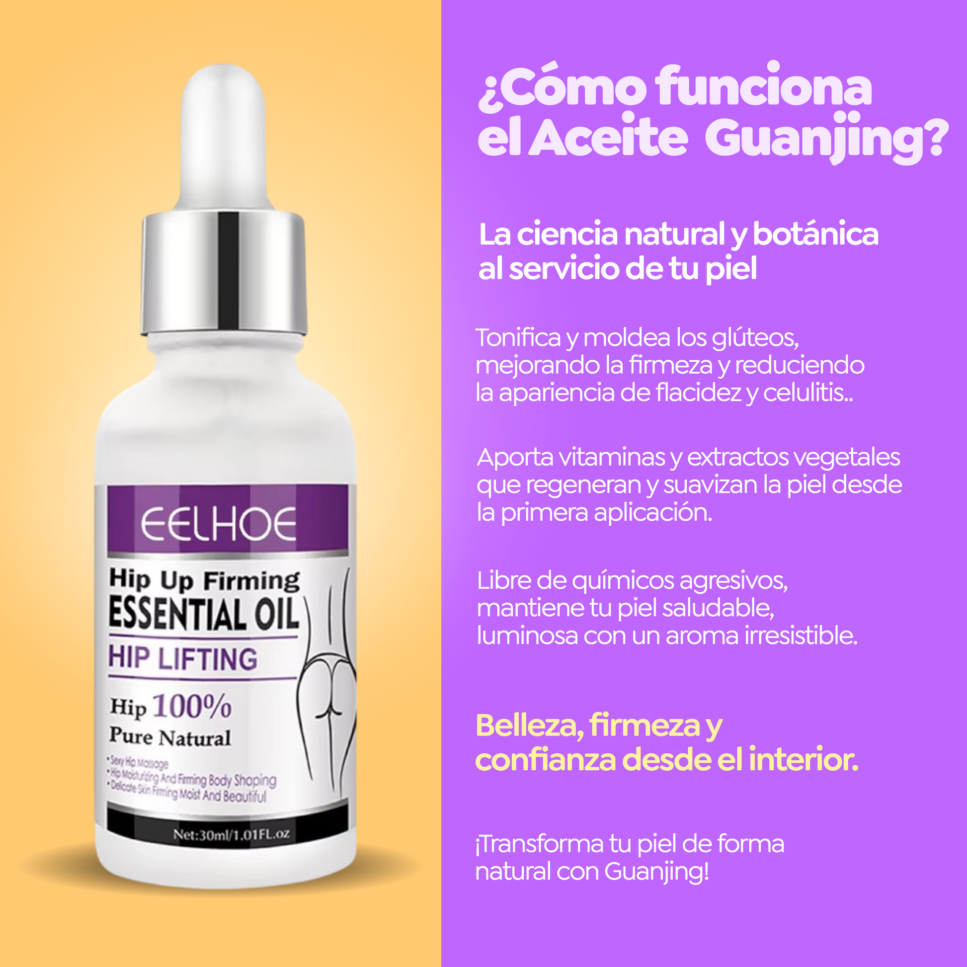 No, el Aceite Guanjing se promueve como una alternativa para obtener glĂșteos firmes y con volumen sin una sola cirugĂa. Se destaca que su fĂłrmula es 100% Puro y Natural, con aceites esenciales y extractos botĂĄnicos, por lo que no se mencionan efectos secundarios. Es una forma segura de rejuvenecer y nutrir la zona.